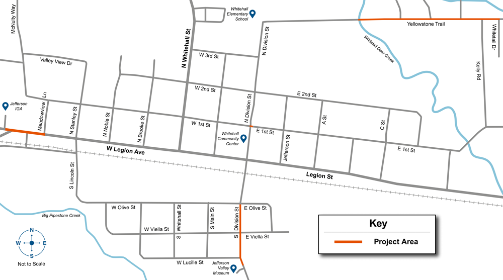 This project will improve pedestrian safety and accessibility by adding new ADA-compliant sidewalks in key areas of Whitehall. New sidewalk segments will help connect residential areas and community destinations, including Whitehall schools, the Community Center, the Recreation Complex, the Jefferson Valley Museum, and Jefferson Fresh Foods. Construction is expected to last approximately two months. We look forward to making Whitehall a safer, more connected community.